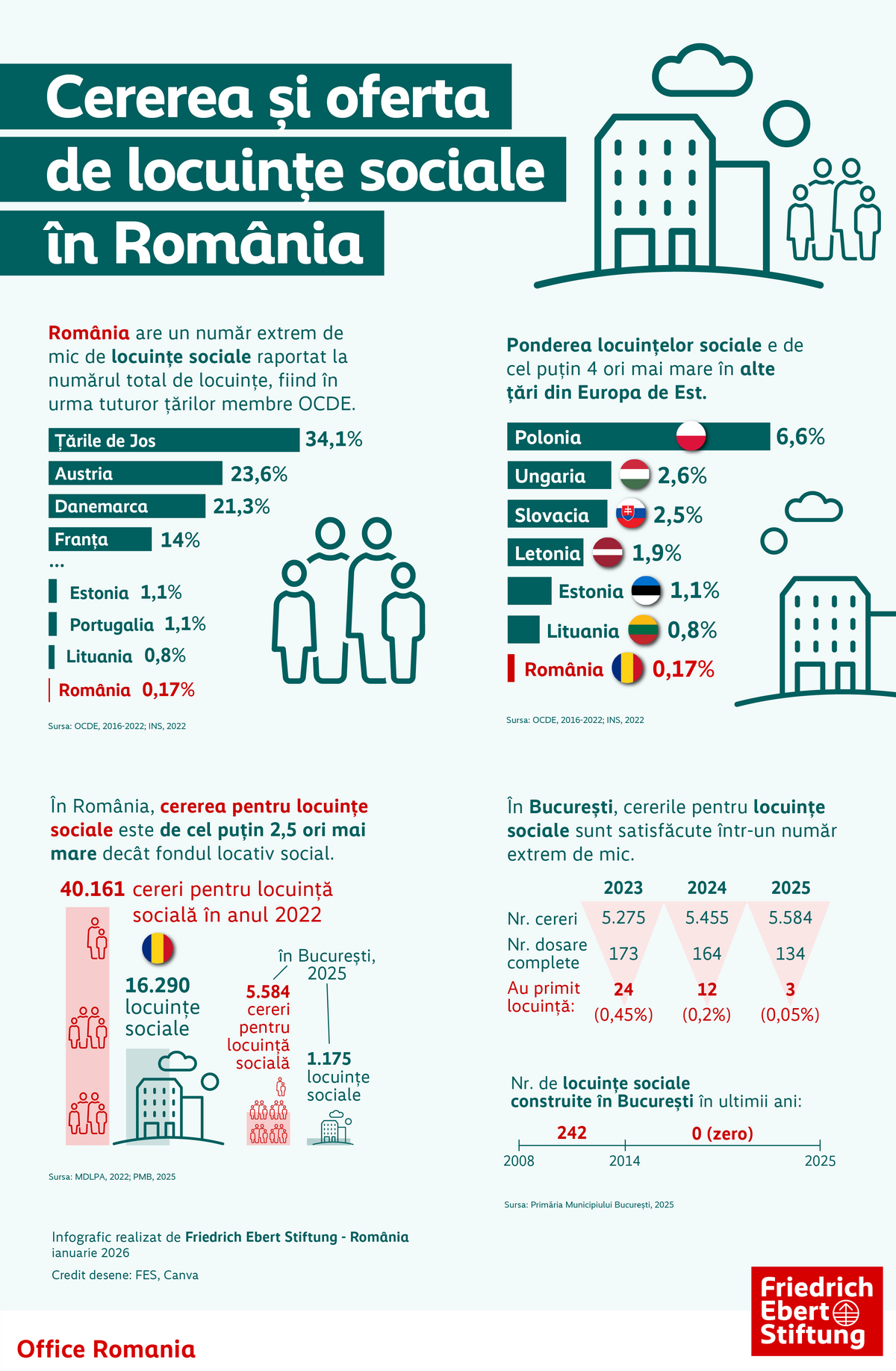 România se află pe ultimul loc din UE în ceea ce privește locuințele sociale, cu doar 0,17% din fondul locativ național fiind locuințe sociale. În țările din Europa Centrală și de Est procentul variază între 6,6% în Polonia și 0,8% în Lituania, în timp ce în Europa de Vest variază între 34,1% în Olanda și 10,9% în Finlanda, conform datelor OCDE pentru anii 2020–2024, prelucrate de Monitorul Social, proiect al Fundației Friedrich Ebert.