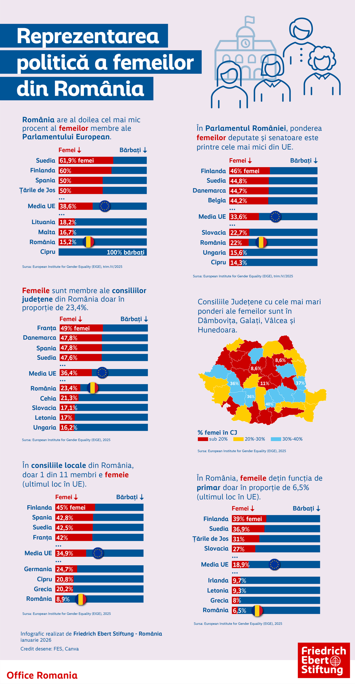 România continuă să aibă o slabă reprezentare a femeilor în funcțiile de parlamentare, europarlamentare, membre în consiliile locale și primari, comparativ cu alte state din Uniunea Europeană, arată datele oficiale din 2025 ale Institutului European pentru Egalitate de Gen (EIGE).